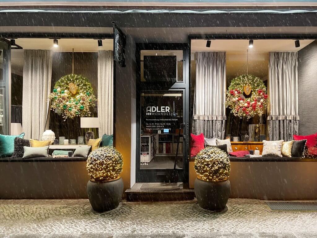 Die Schaufensterfront von Adler Wohndesign – auch die Buchsbäume dürfen sich in diesem Jahr über eine weihnachtliche Beleuchtung freuen.