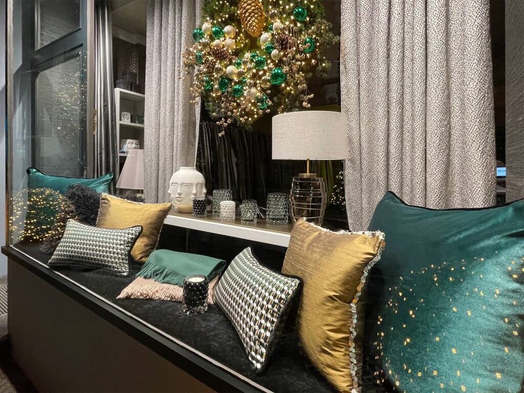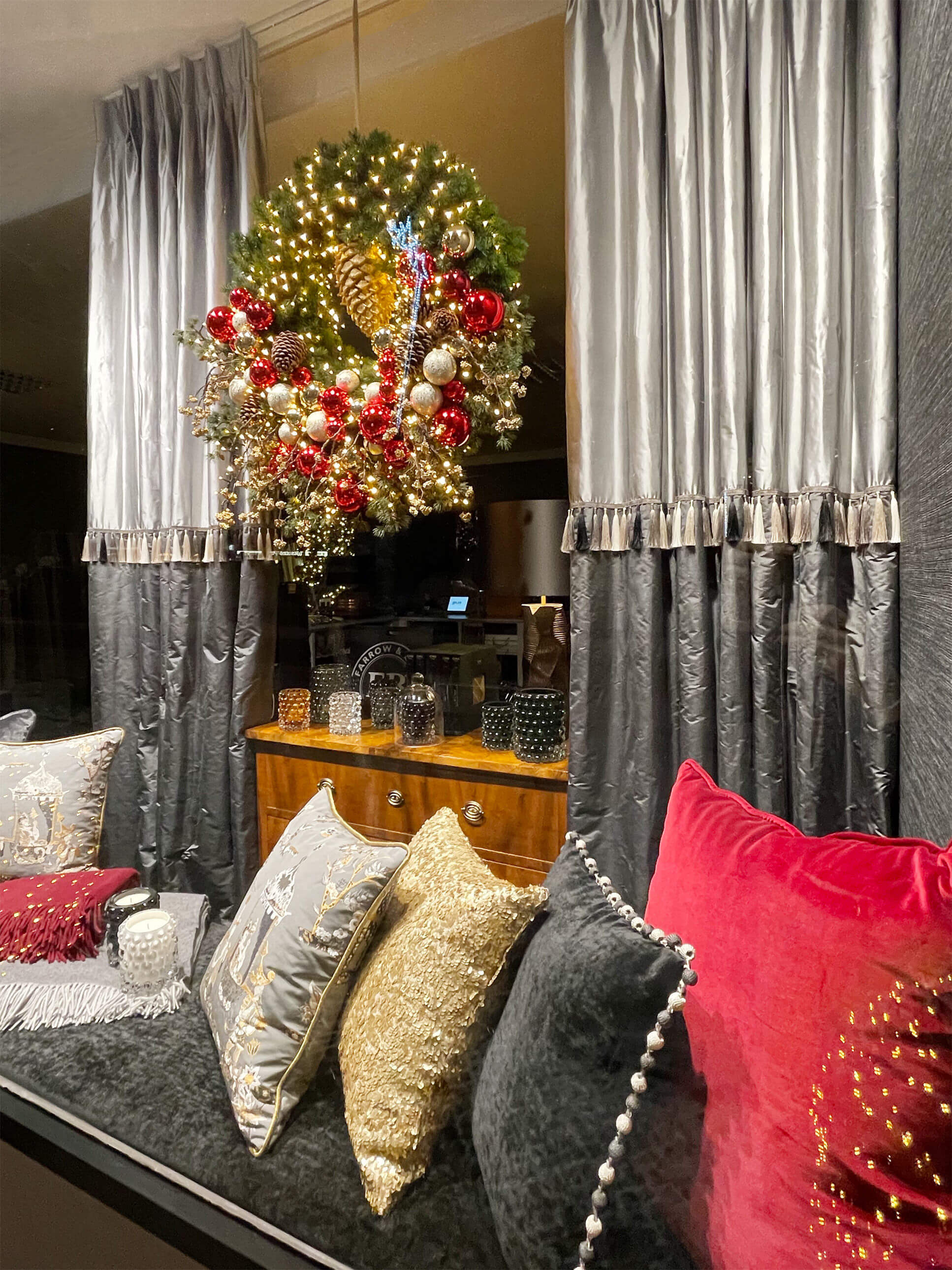 Die diesjährigen Weihnachtsfenster zeigen neben zwei prachtvollen Kränzen gefütterte Seidenvorhänge mit Posamenten, spezielle Kissen sowie Decken und passende Windlichter.
