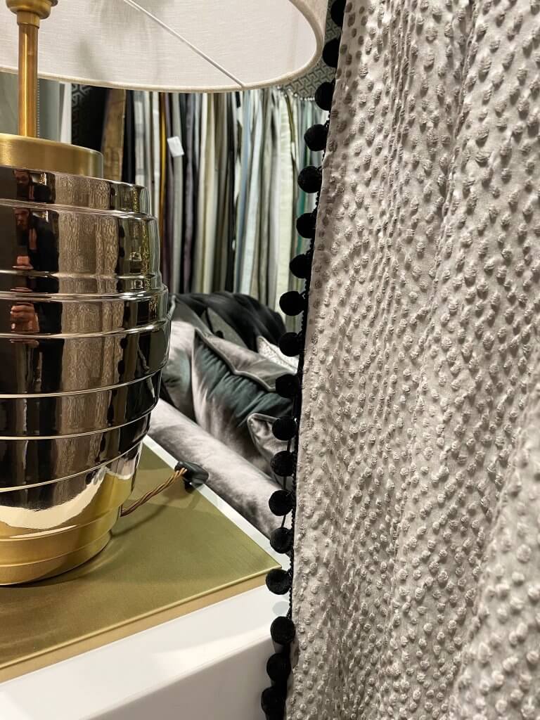 Der cremefarbene Vorhang hat eine tolle Struktur und besteht aus einer Mischung aus Seide und Leinen. Als kleines Extra haben wir ihm eine seitliche Einfassung mit schwarzen PomPons spendiert.