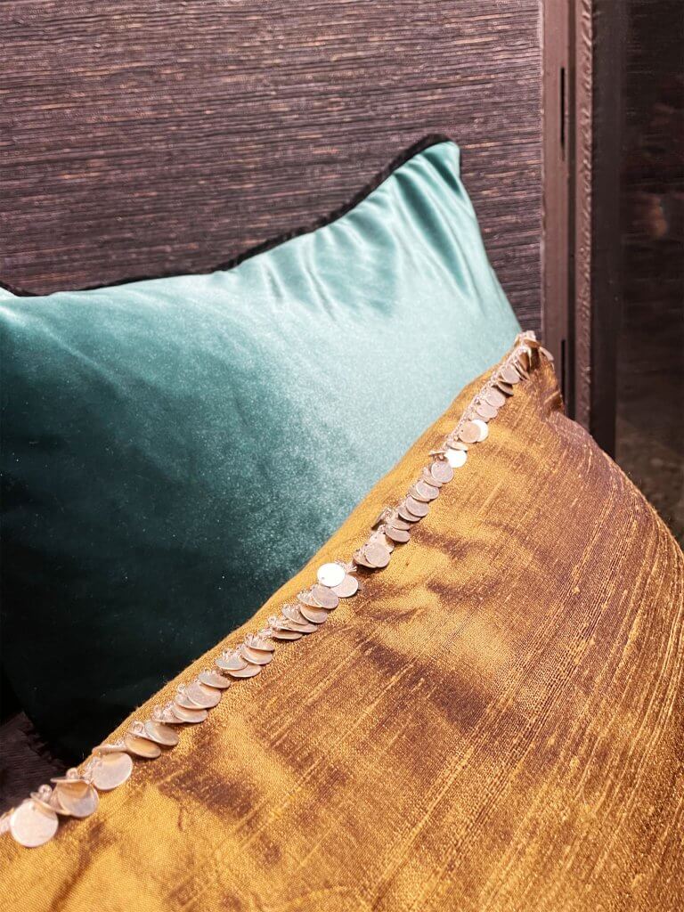 Dazu haben wir ein changierendes Seidenkissen in Bronze angefertigt und dieses am Rand mit edlen Metall-Pailetten abgesetzt. Das schlichte grüne Samtkissen ist mit einem passenden feinen Samtkeder ausgestattet.