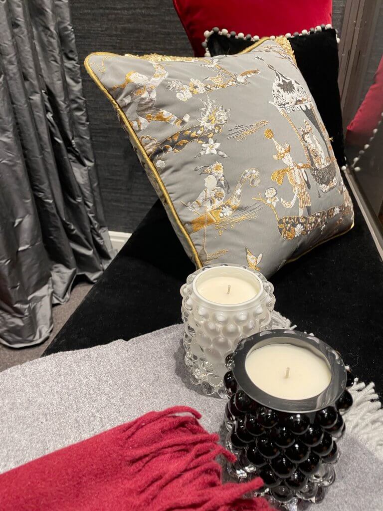Im rechten Schaufenster sehen Sie verschiedene Grautöne, Rot als Akzent und ebenfalls etwas Gold. Hier sind die Vorhänge aus reiner Seide, dazu passende Kissen und Woll- und Kaschmirdecken.