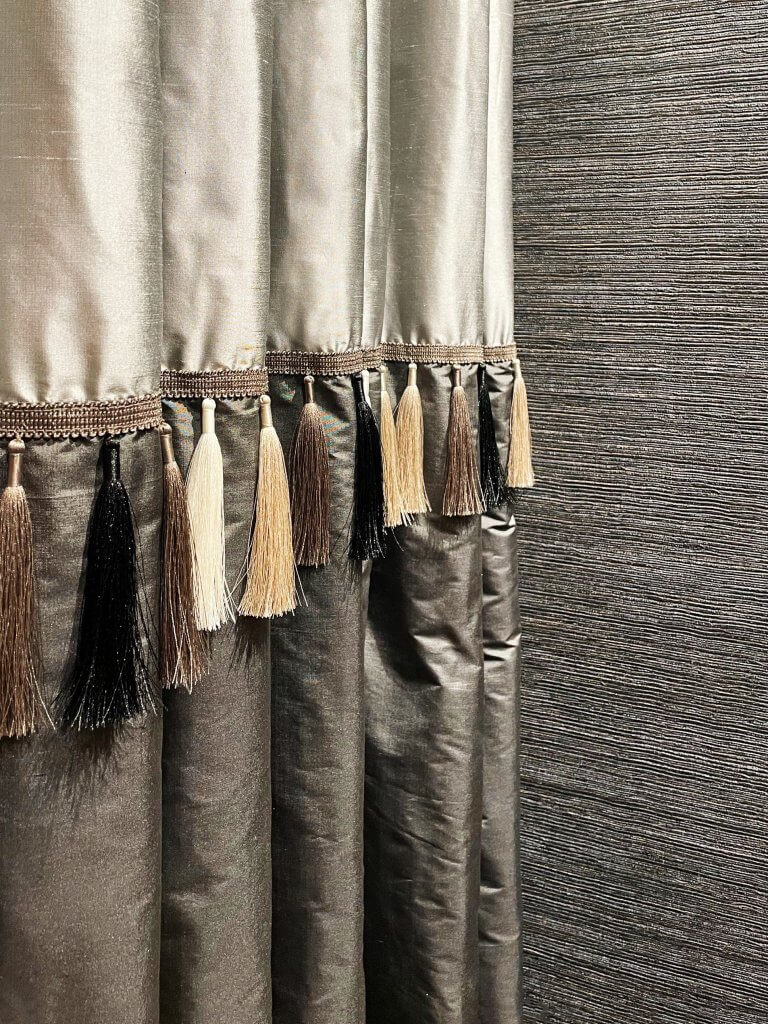 Die Vorhänge sind zweifarbig. Auf die Teilung haben wir eine Bordüre mit verschiedenfarbigen Quasten gesetzt.
